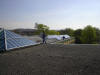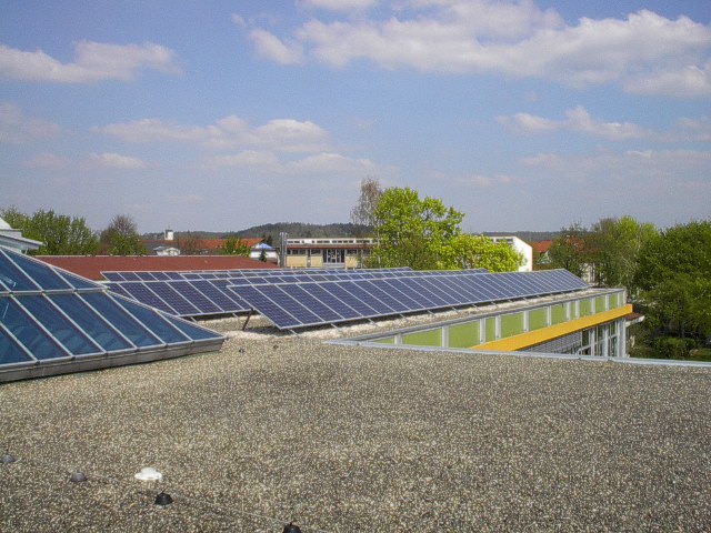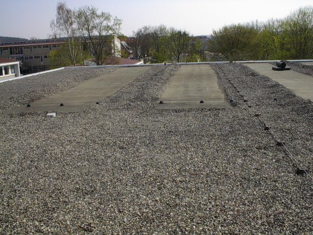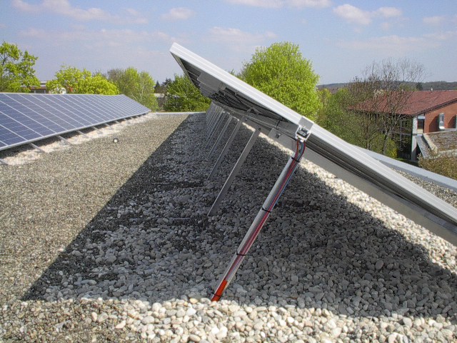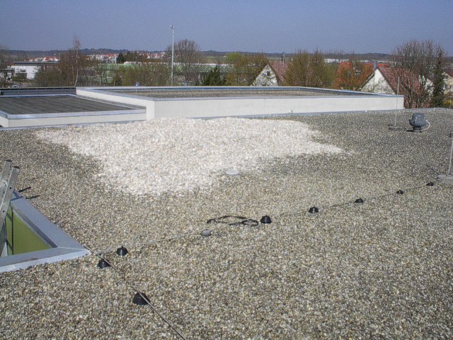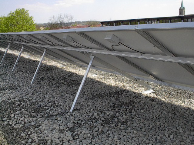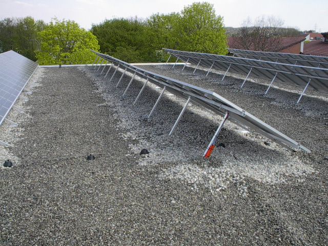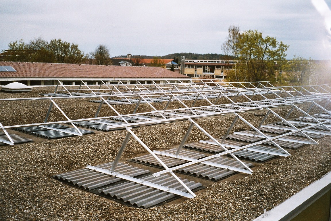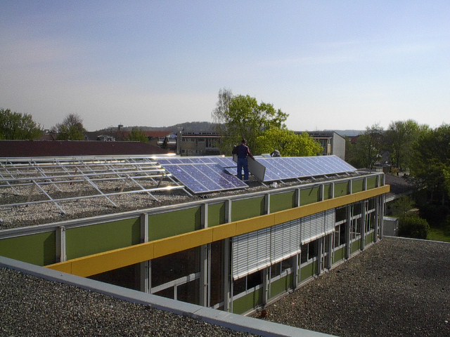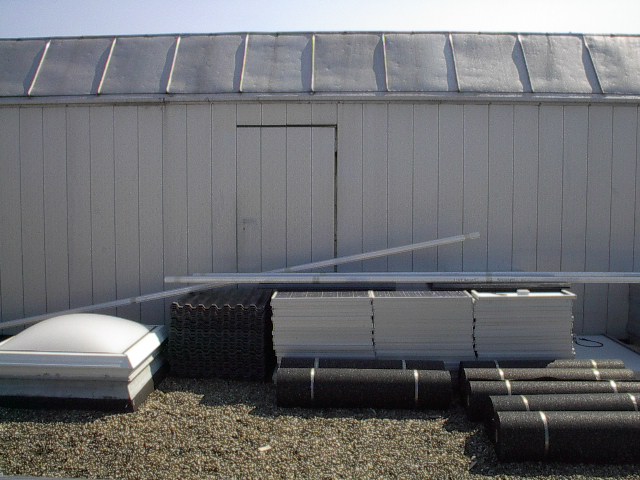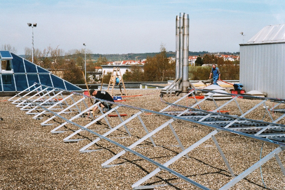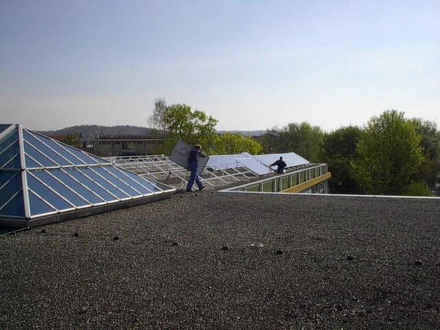 einem Autokran die 102 Module und alle Montagematerialien auf das 8m hohe Dach