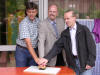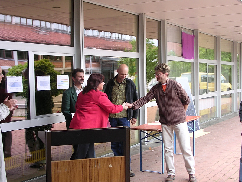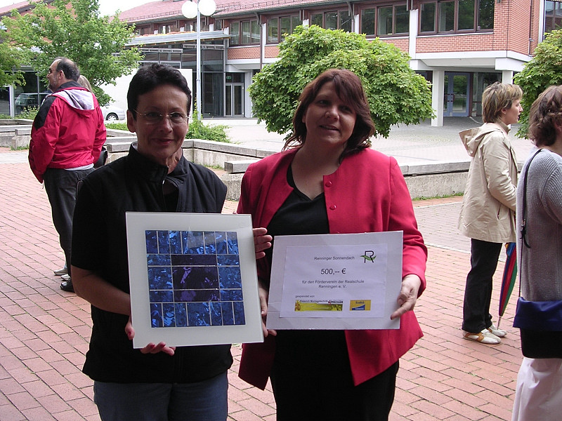 Die öffentliche Einweihung des Renninger Sonnendachs fand am 19. Juni 2004 statt. Ca. 60 interessierte Bürgerinnen und Bürger folgten der Einladung und trafen sich um 16:00 Uhr vor der Realschule. Das Programm war wie folgt: - Begrüßung durch Herrn Dr. Gebicke, Sprecher der lokalen Agenda 21 - Grußwort von Bürgermeister Faißt - Überreichung einer Spende über 500 € an den Förderverein der Realschule - Einweihung und Inbetriebnahme des Renninger Sonnendachs - Erfrischungen und Gespräche Die Pressemitteilung können Sie hier herunterladen. Die Bilder vermitteln einen kleinen Eindruck von der Feier (bitte auf das jeweilige Bild klicken, um es zu vergrößern). |